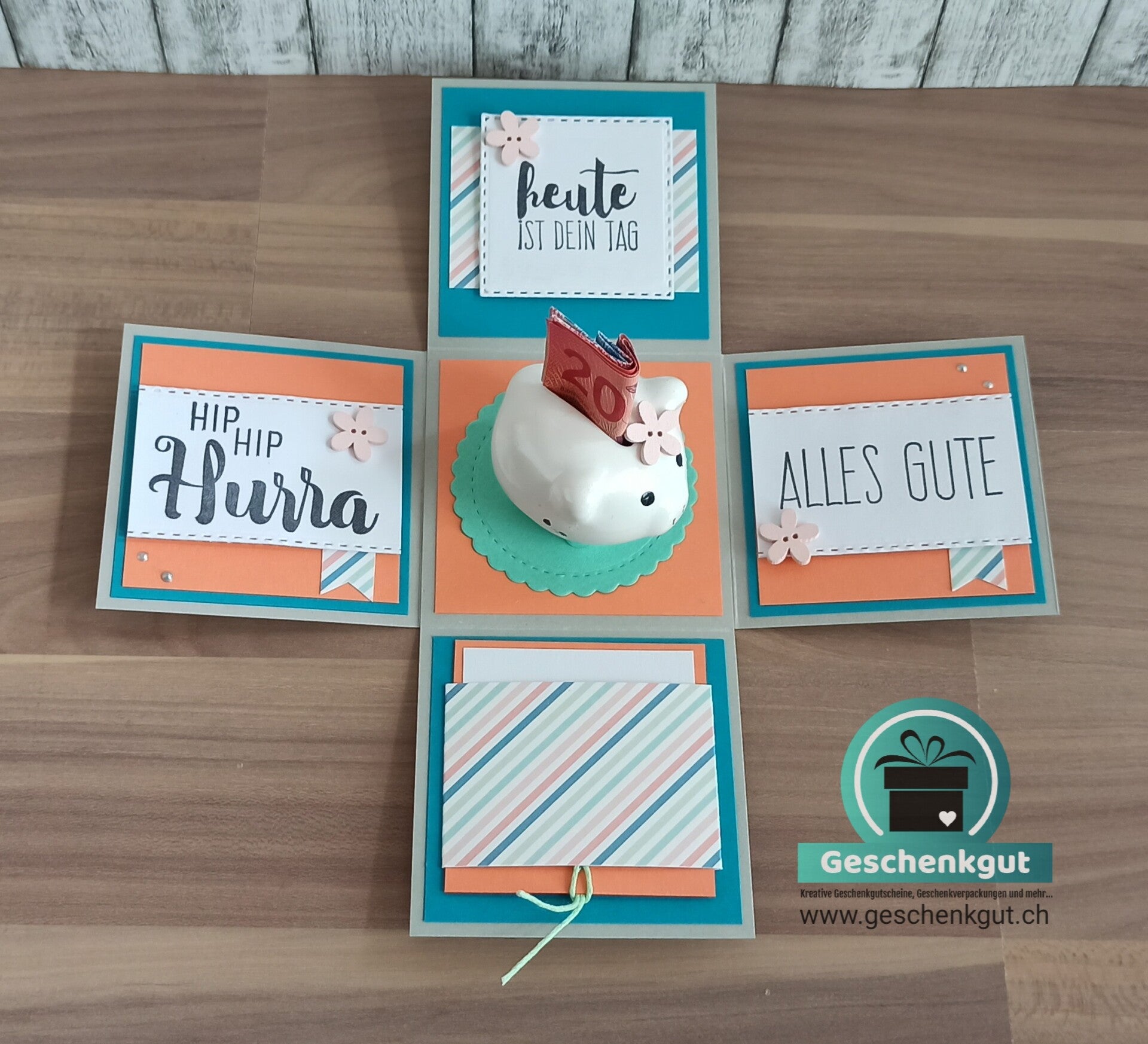 Mit Sparschweinchen in der Mitte. (Dieses wird ohne Geldschein geliefert!)